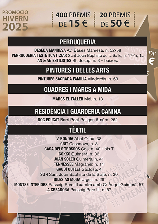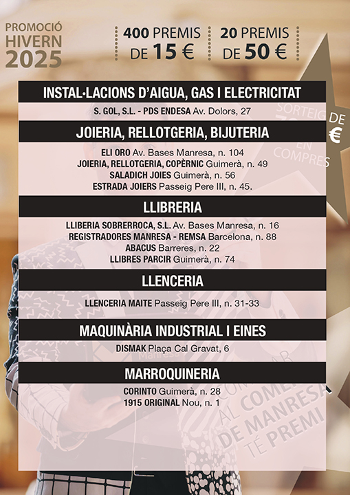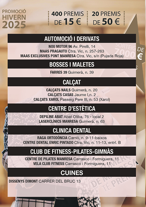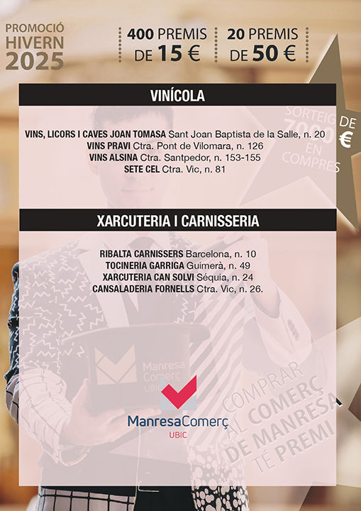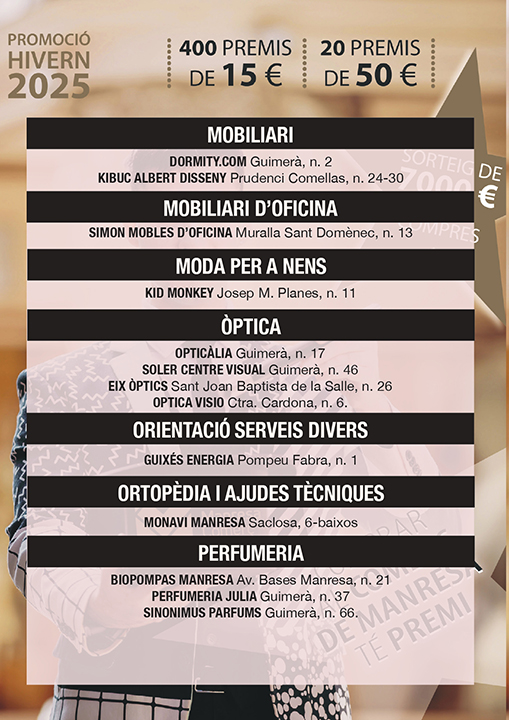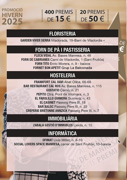 Ja pots consultar la llista d’establiments que participen en la Promoció Comercial d’Hivern 2025, vigent fins a l’11 de gener de 2026. Tots els comerços participants disposen de butlletes amb premis directes, perquè puguis guanyar al moment amb les teves compres. Els rasca premiats es poden bescanviar en el mateix moment de la compra a la botiga on ha sortit el premi o bé, la persona guanyadora, se’l pot guardar i utilitzar en una propera compra a qualsevol dels altres establiments que participen en la promoció. Consulta a continuació tots els establiments adherits a la promoció. Comerços participants — Promoció Comercial d’Hivern 2025