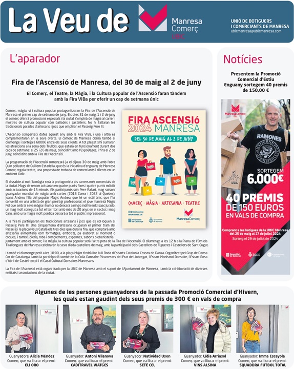 Comerç, màgia, vi i cultura popular protagonitzaran la Fira de l’Ascensió de Manresa el primer cap de setmana de juny. Els dies 31 de maig, 1 i 2 de juny el comerç oferirà promocions especials i la ciutat s’omplirà de màgia al carrer i mostres de cultura popular com ballades i castellers. No hi faltaran les tradicionals parades d’artesans i jocs que ompliran el Passeig Pere III.